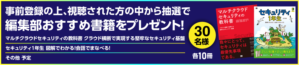 | 抽選でプレゼント | 事前登録のうえ、当日視聴された方の中から抽選でいずれかの書籍をプレゼントいたします。 ● 『マルチクラウドセキュリティの教科書 クラウド横断で実現する堅牢なセキュリティ基盤』10名様 ● 『セキュリティ1年生 図解でわかる!会話でまなべる!』10名様 ● 他、書籍 10名様 ※発送をもって当選とかえさせていただきます。発送は4月下旬を予定しております。 |